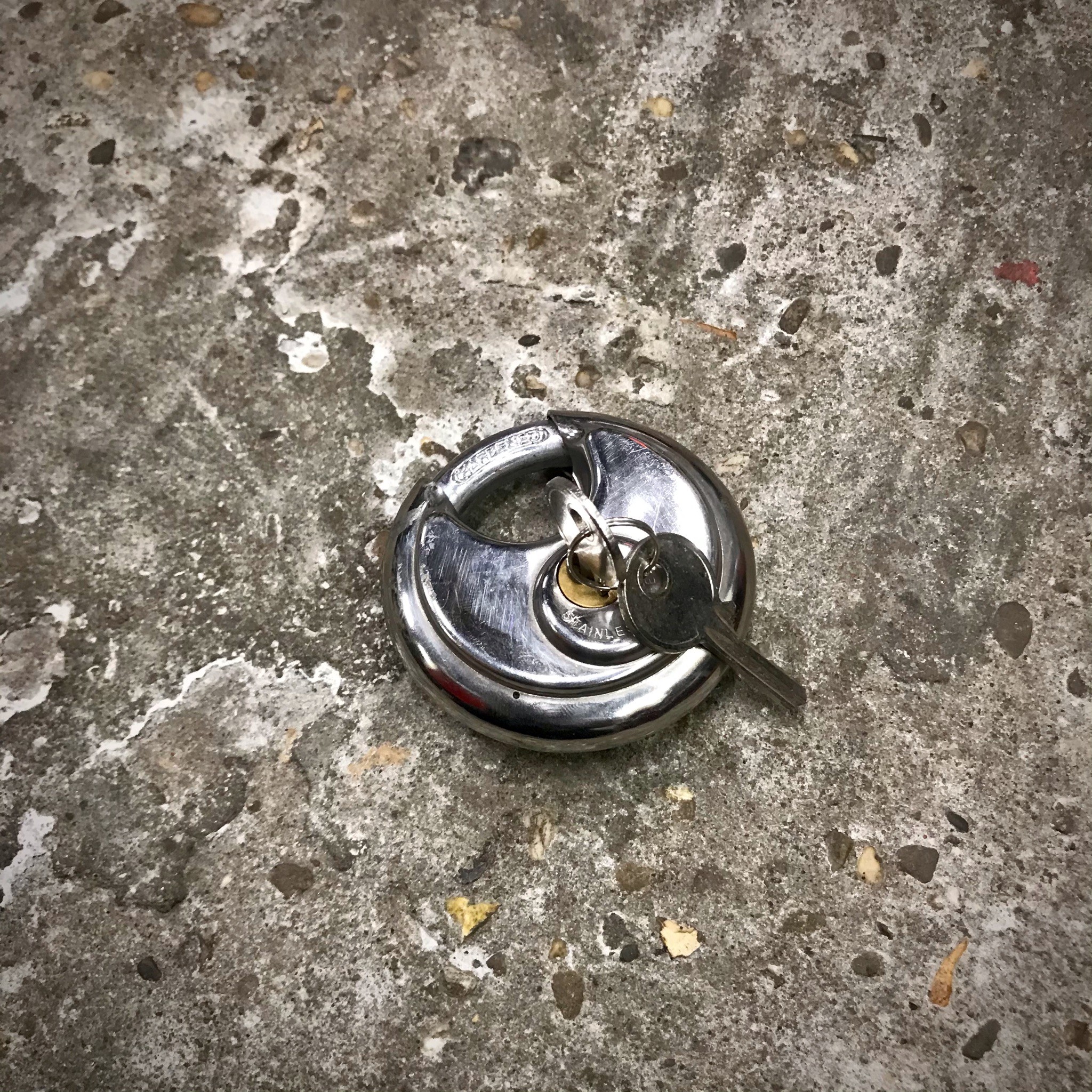 Robuuste schijfvormige veiligheidshangslot met geharde beugel, roestvrijstaal.