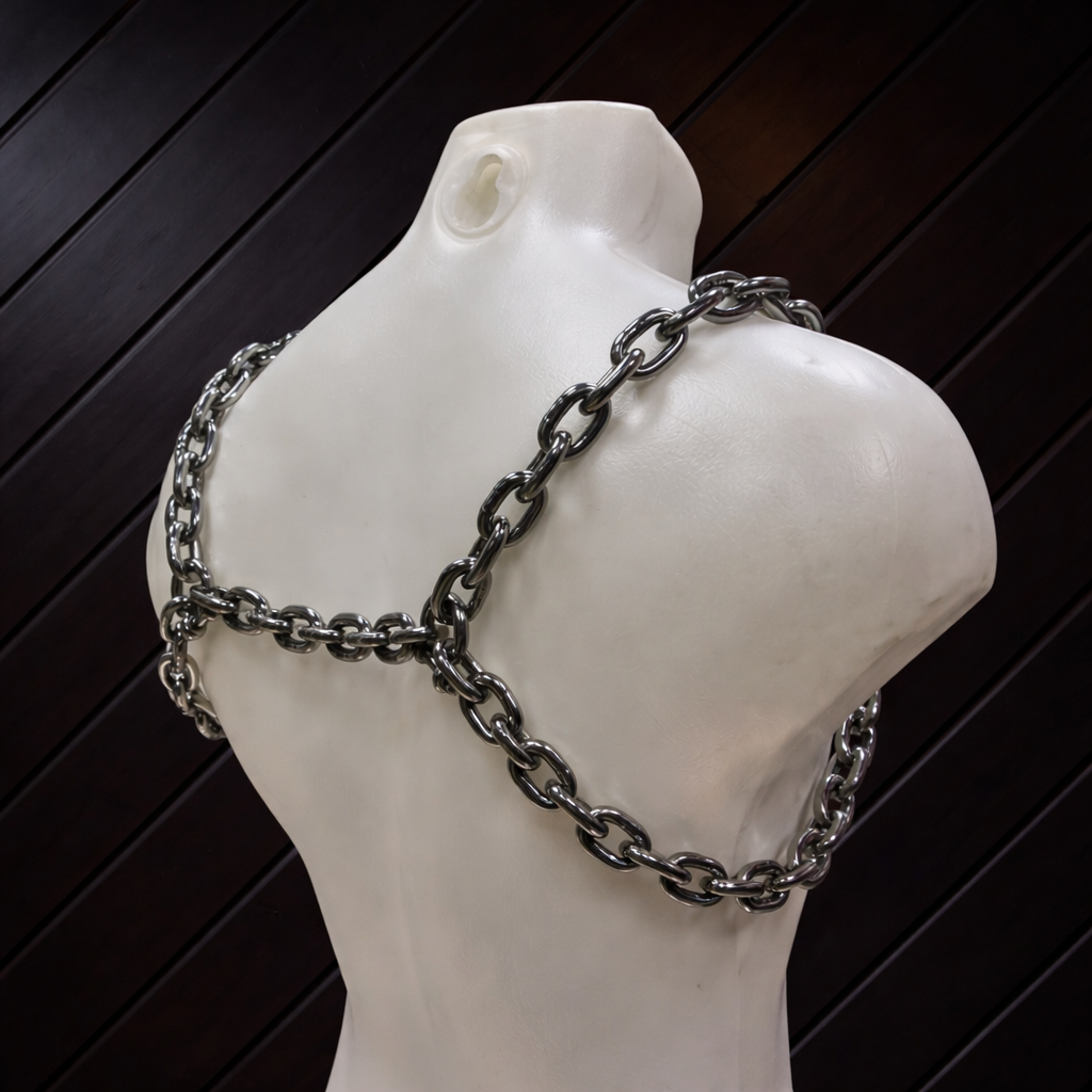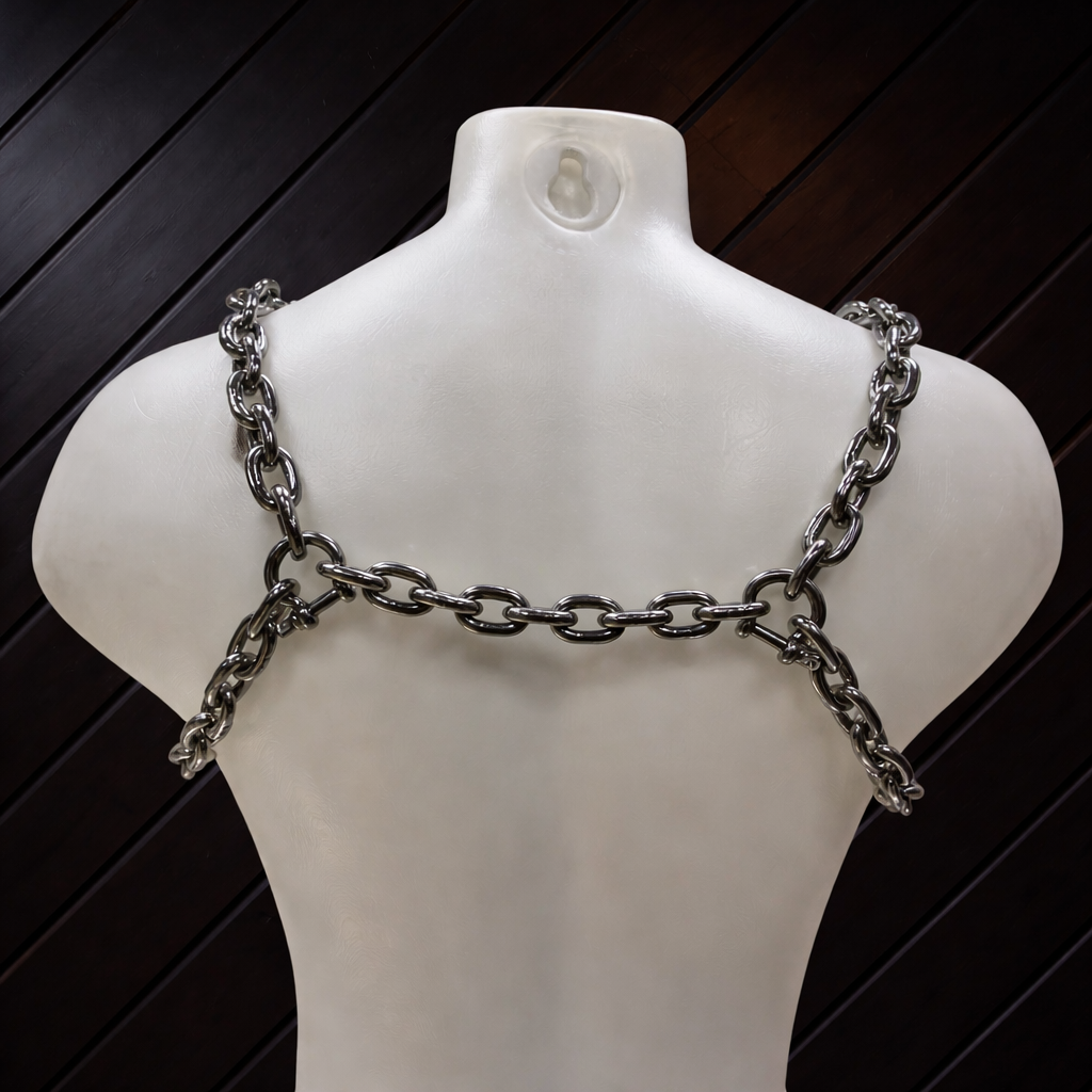 Het harnas is opgebouwd uit 6 mm ketting en afgewerkt met robuuste RVS harpsluitingen, wat zorgt voor een betrouwbare en industriële uitstraling. De constructie is eenvoudig maar doordacht, waardoor het harnas direct goed zit en prettig draagt.