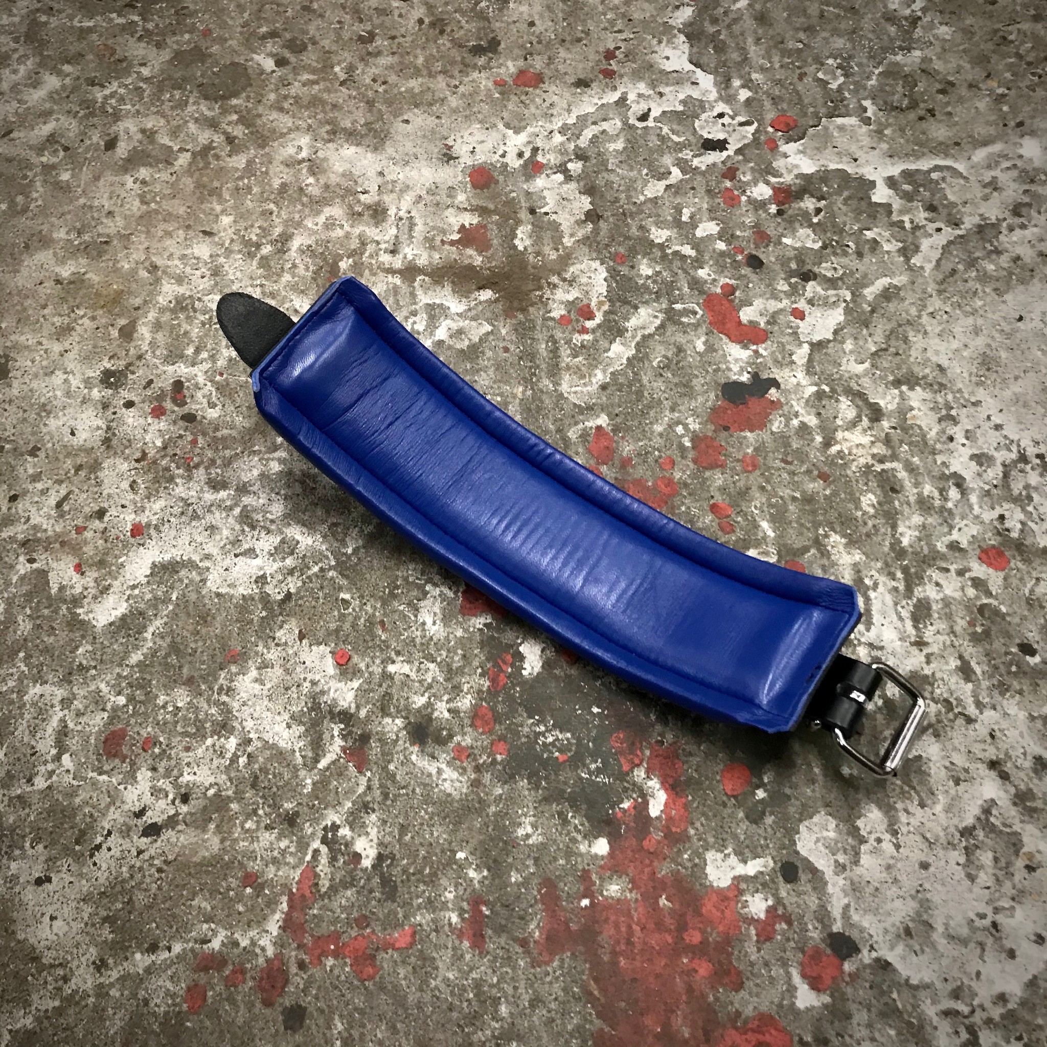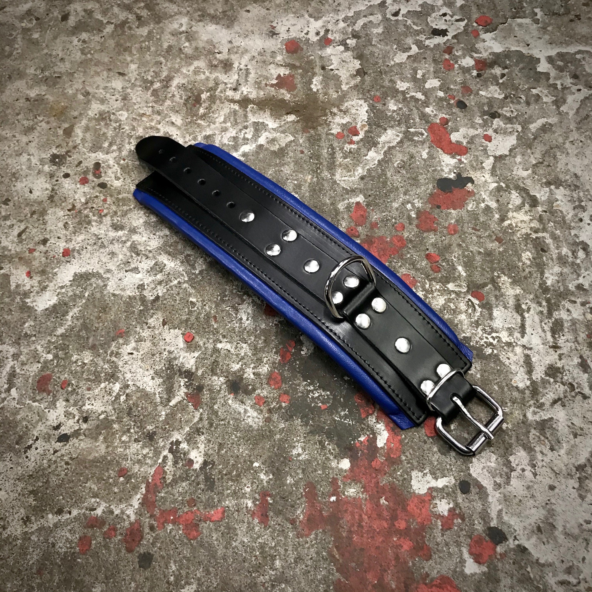 Lederen Enkel-boeien 8 cm. Zwart + Blauwe bies, Per 2 st.
