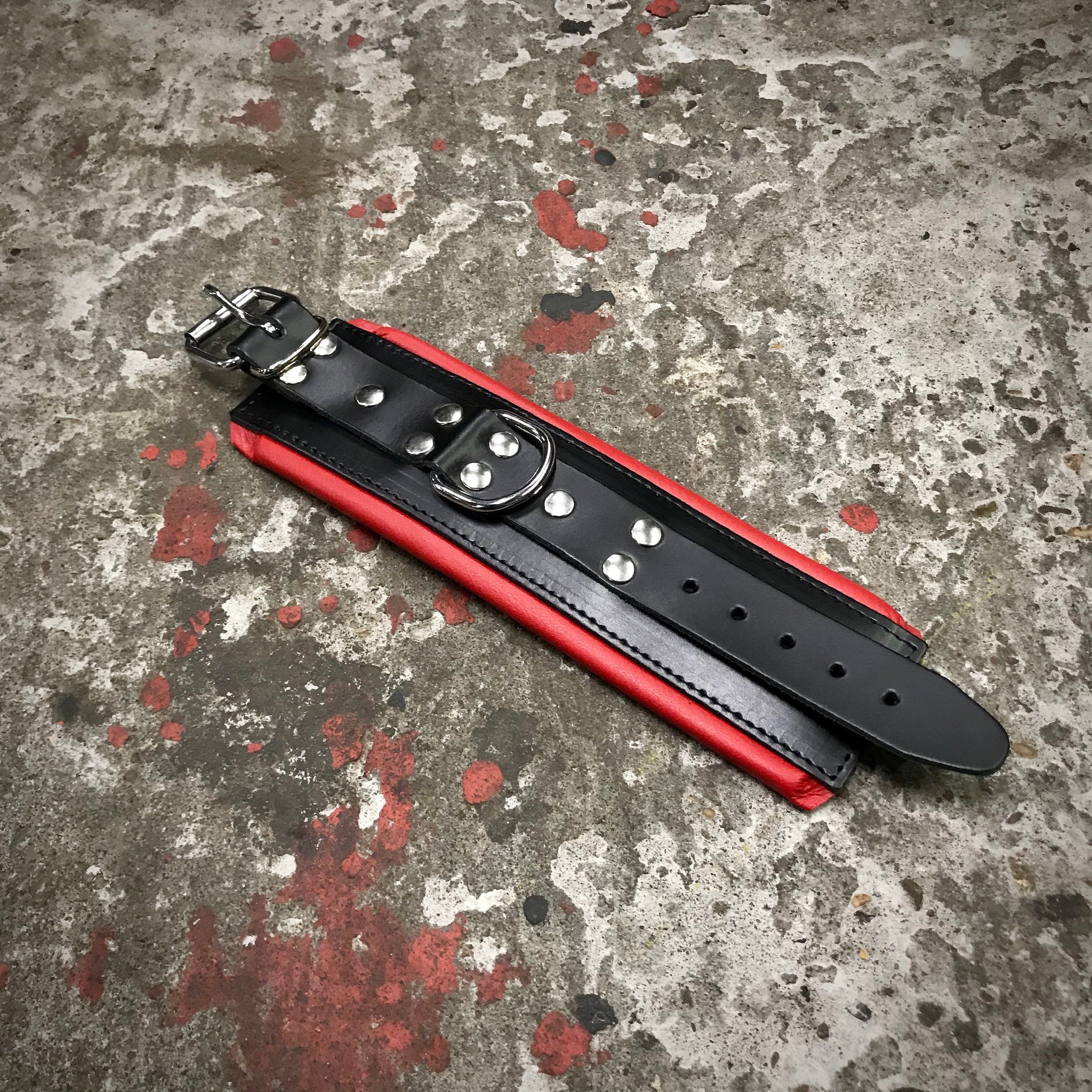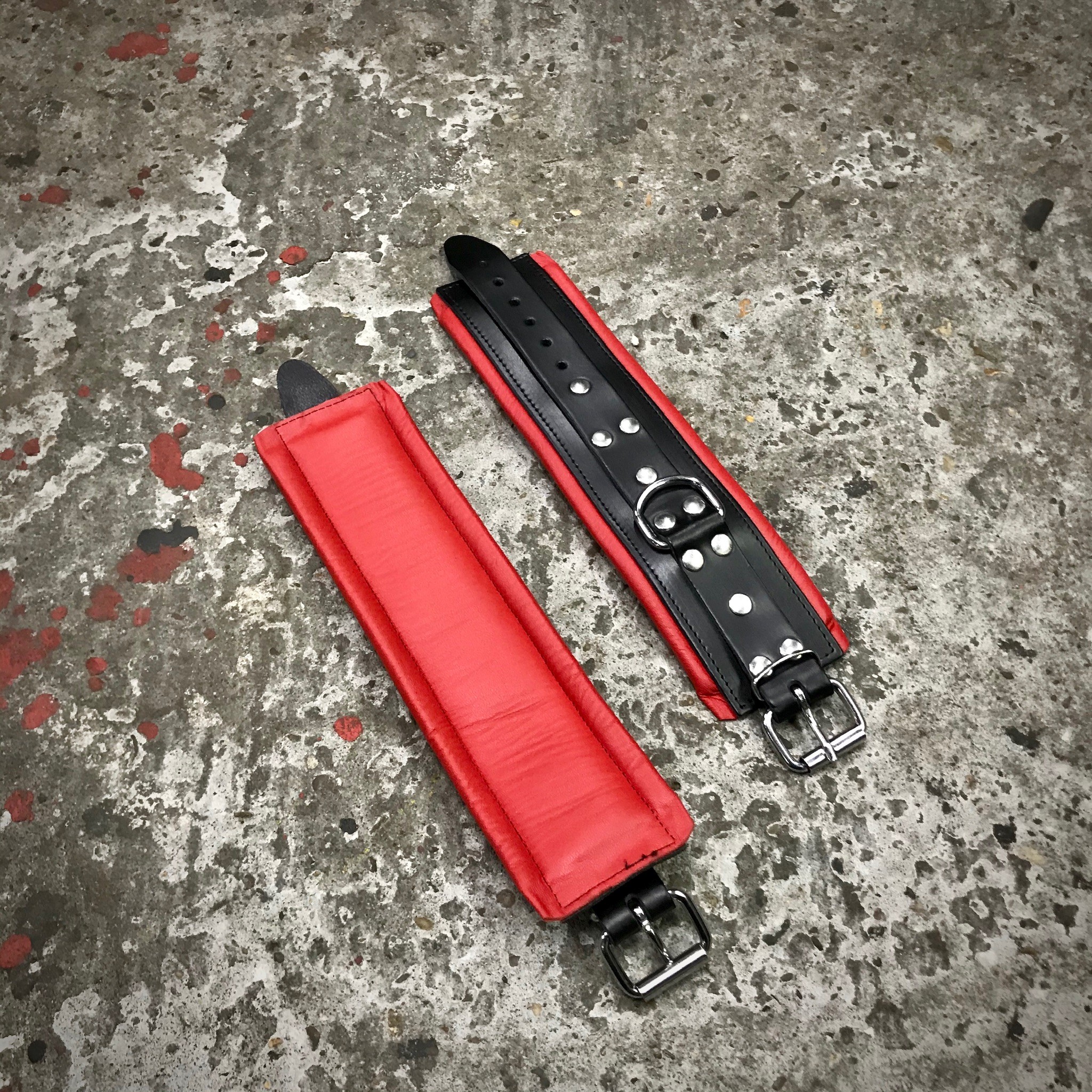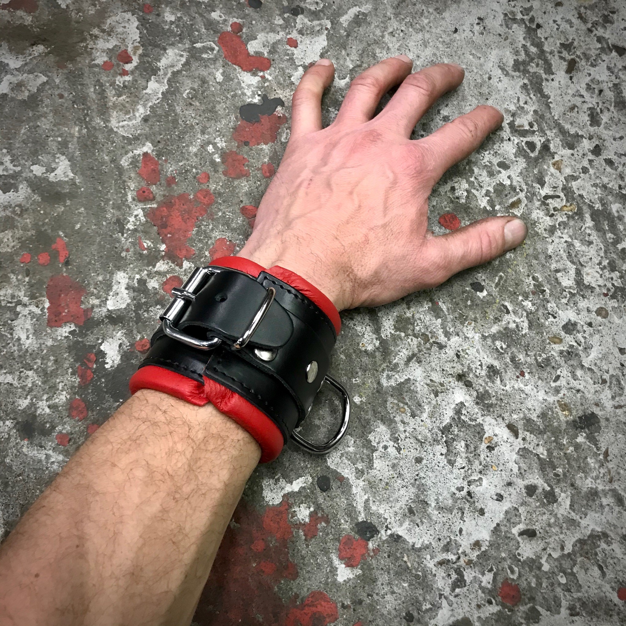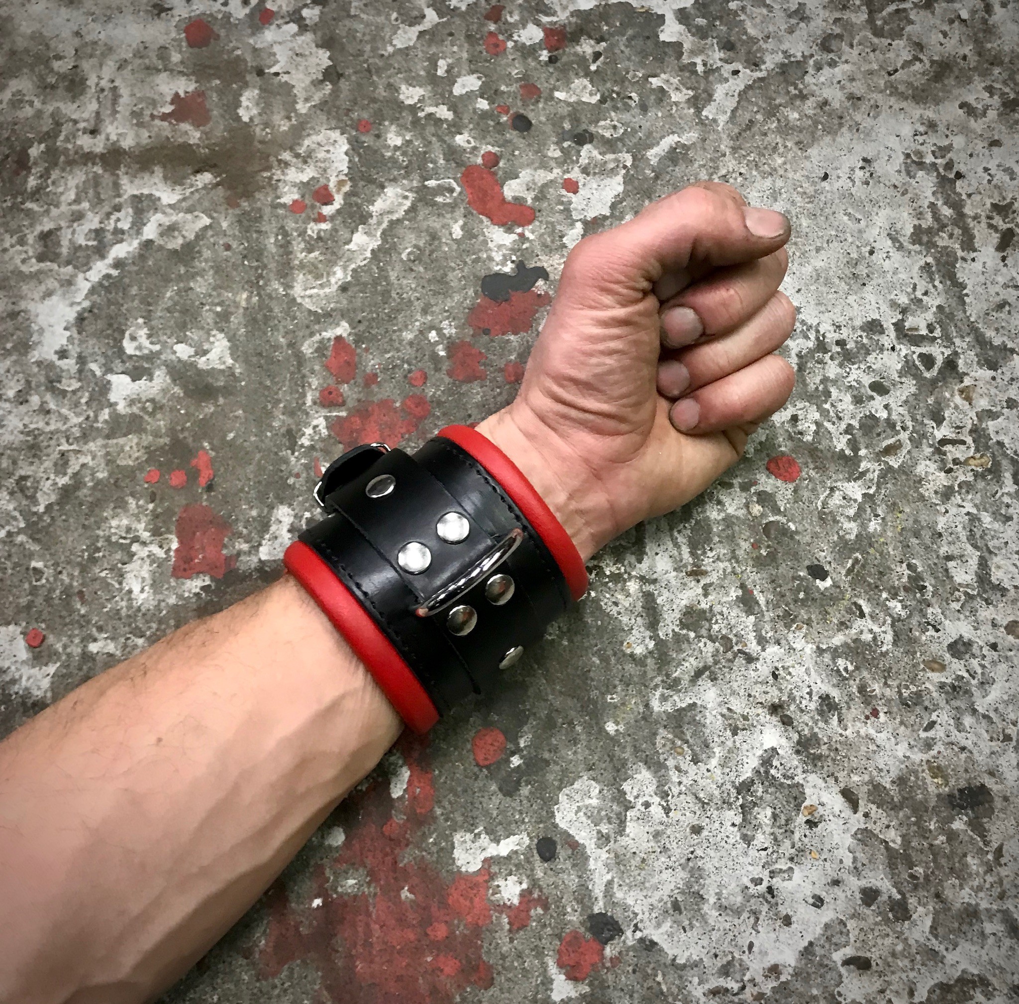 Lederen Pols-boeien, 8 cm. Zwart + Rode bies, Per 2 st.