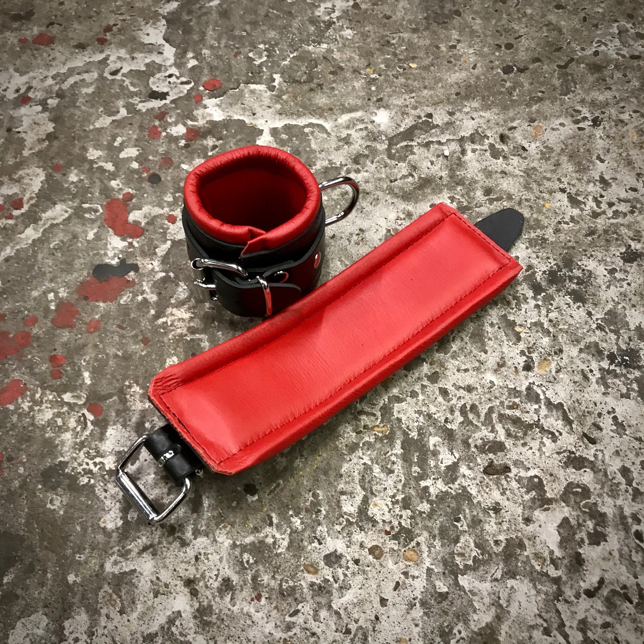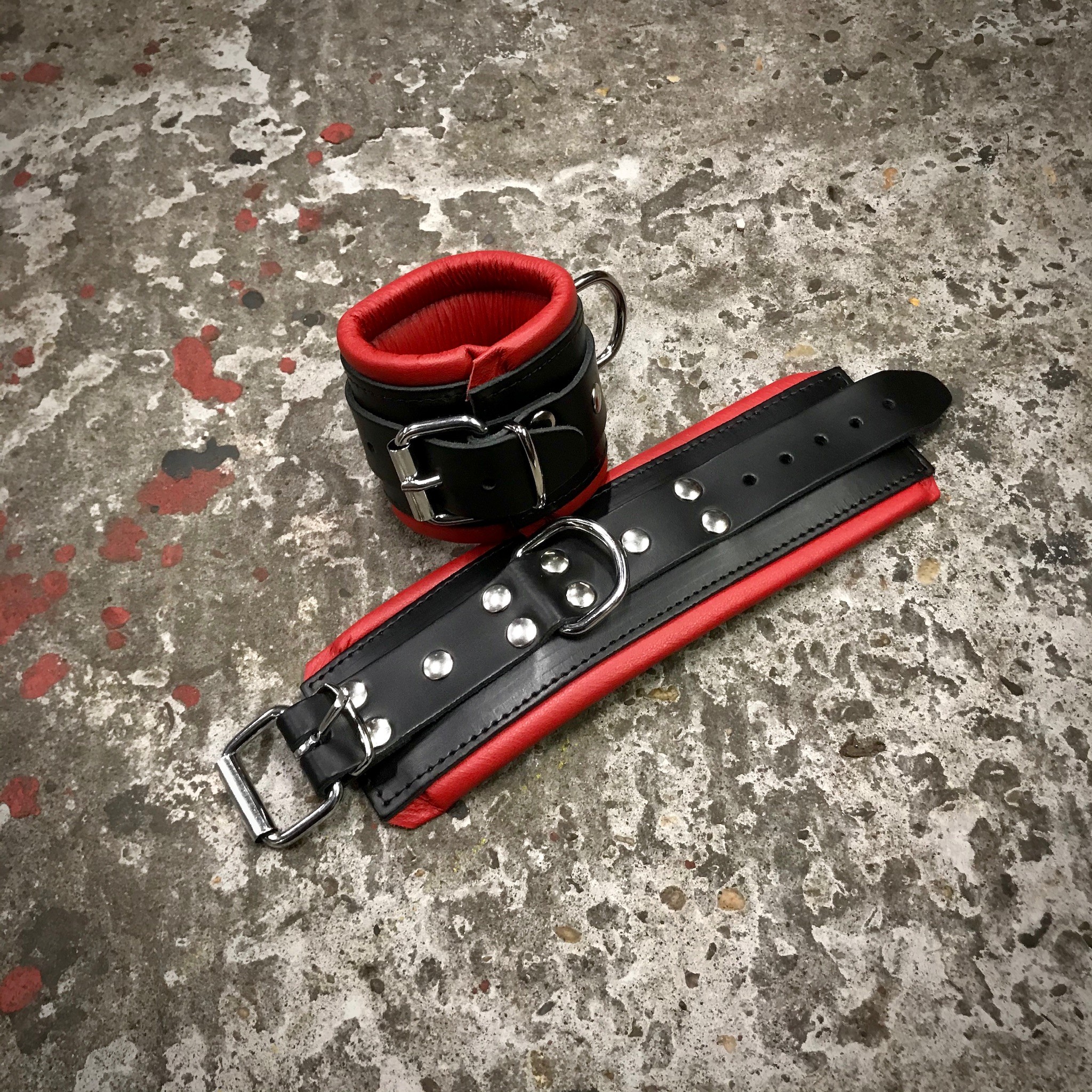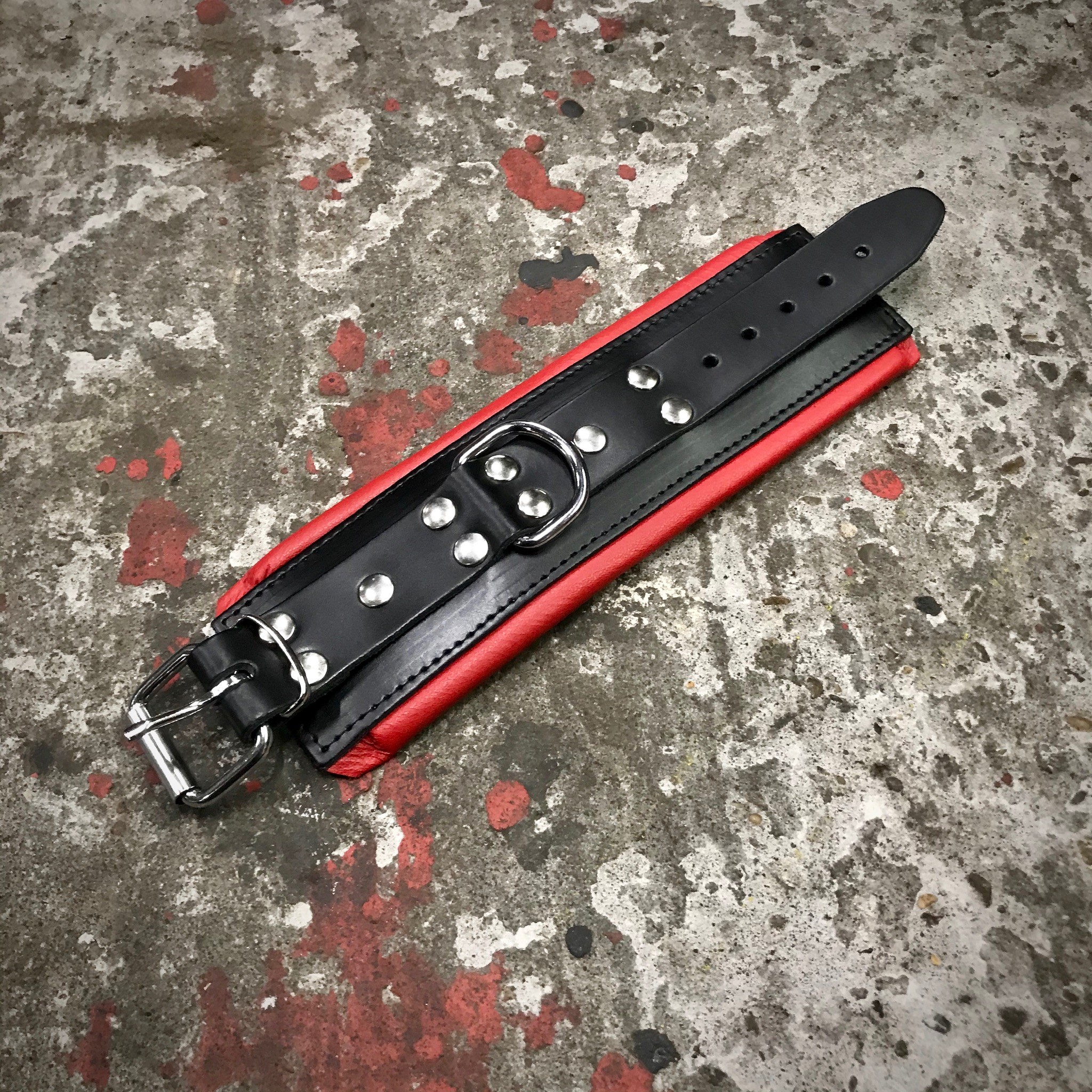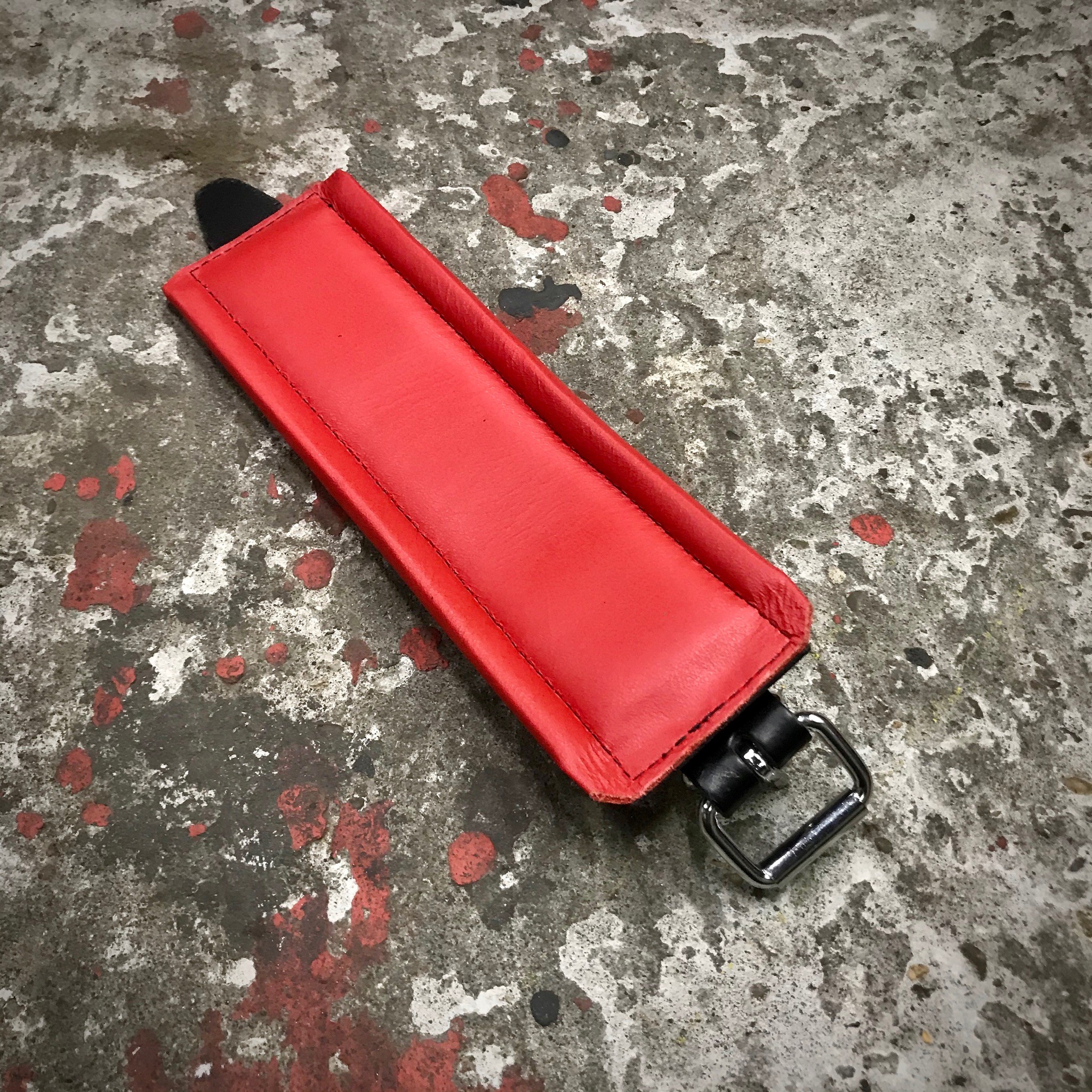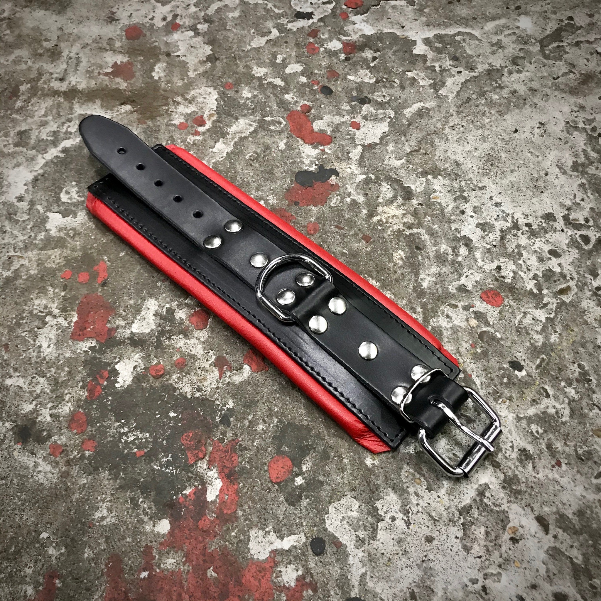 Lederen Pols-boeien, 8 cm. Zwart + Rode bies, Per 2 st.